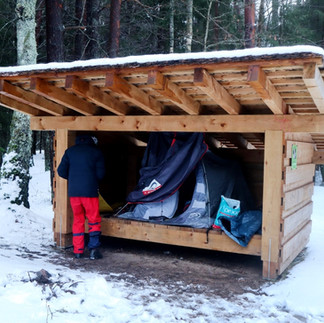 Runājam, cik gan forši, ka te ierīkotas tādas nojumītes nakšņošanai. Ziemā ideāli – nenāk aukstums no apakšas, lietainā laikā arī perfekti – nekas neizlīst, un arī vasarā forši – var iztikt bez telts. Igaunijā šādas nojumes ir ļoti populāras, prieks redzēt, ka šāda mode lēnām sāk ieviesties arī Latvijā. Šī vieta Gaujas krastā netālu no Katrīnas ieža vispār ir ļoti labiekārtota – te pieejama ne tikai nojume un ugunskura vieta, bet arī galds ar soliņiem un sausā tualete.
